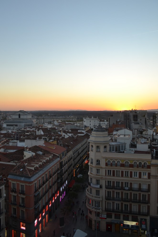 En las tardes nos relajábamos un rato en las diferentes terrazas y azoteas tomándonos unas cañas para luego seguir descubriendo la ciudad. A 100 metros del metro Callao sobre la calle del Carmen puedes encontrar la terraza del Corte Ingles, la terraza se encuentra en el noveno piso, con una oferta gastronómica variada y de calidad con comida internacional y nacional, los precios son bastante accesibles, pero los mas hermoso es la vista desde ese lugar, para disfrutar de un sublime atardecer de la ciudad.