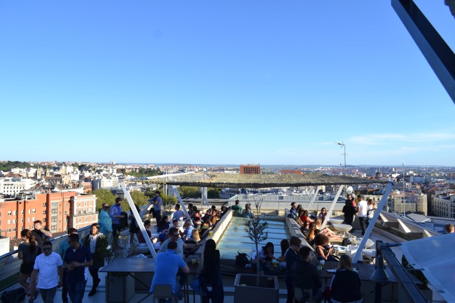 Otra de la azoteas que deben visitar es la del Círculo de Bellas Artes, ubicado en la calle Alcalá y la Gran vía uno de los centros artísticos mas importantes de Europa, donde exponen todo tipo de arte, el edificio considerado un valor arquitectónico moderno y urbano. Su azotea con una vista 360 de la ciudad, para mi la mejor vista , un ambiente para relajarte y una oferta de excelentes cócteles. Pasamos la tarde en esa azotea una ocasión inolvidable, un momento perfecto para enamorarte mas de esta vibrante ciudad.